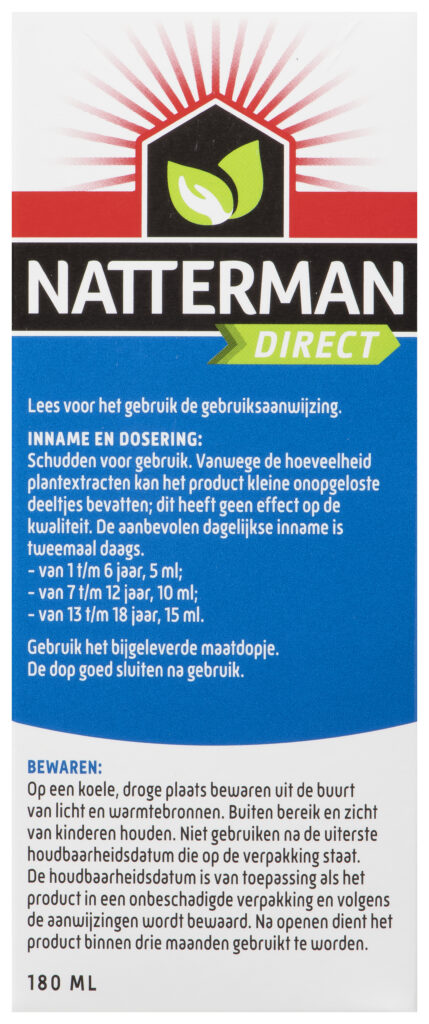 De honing in de hoestdrank zorgt niet alleen voor een aangename smaak, het heeft ook een hydraterende en verzachtende werking. De plantextracten van weegbree, kaasjeskruid, heemst en grindelia bevatten epitheelbeschermende natuurlijke slijmstoffen en harsen. Dit helpt het slijmvlies te beschermen en bevordert de werking van de bovenste luchtwegen. Het zwartebessensap in de Natterman Alle Hoest Kinder Hoestdrank geeft de hoestdrank een lekker smaak.